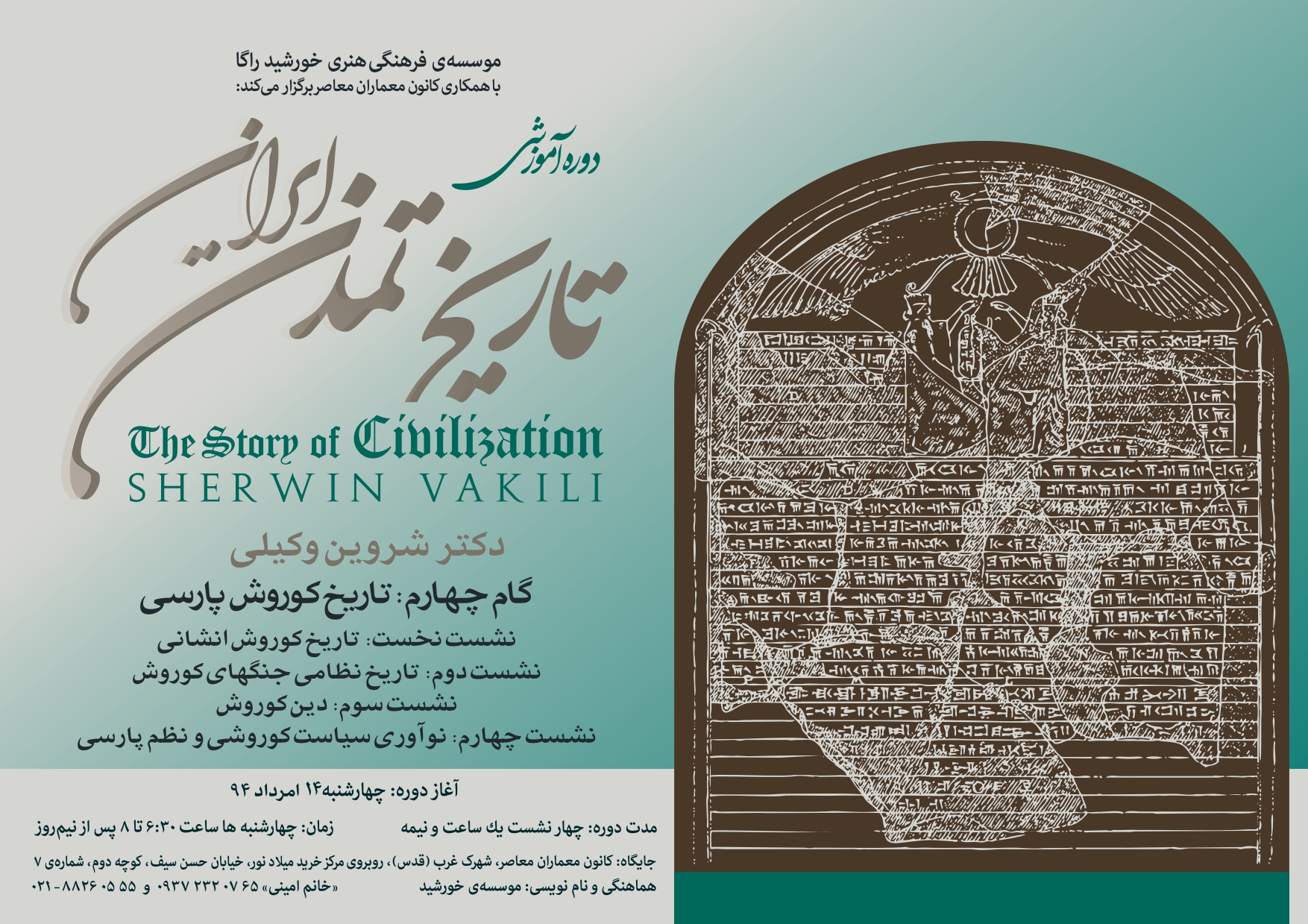 بررسی تاریخ تمدن ایرانی، درونمایهی دورهی تازهی آموزشی-پژوهشی در موسسهی فرهنگی-هنری خورشید است که با همکاری کانون معماران معاصر و به استادی دکتر شروین وکیلی برگزار میشود.