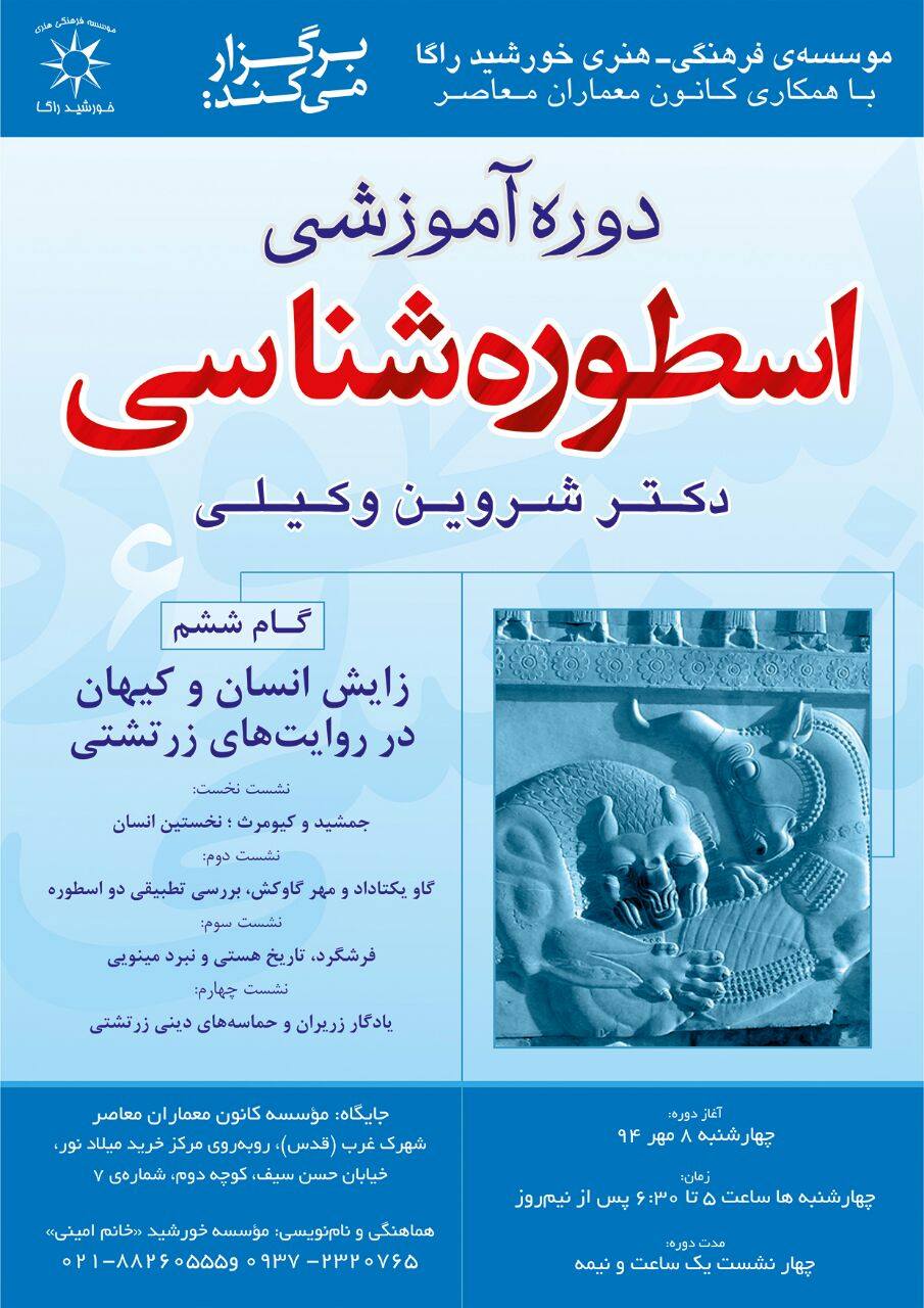 دوره‌ی آموزشی-پژوهشیِ اسطوره‌شناسی که در موسسه‌ی فرهنگی-هنری خورشید، با همکاری کانون معماران معاصر و به استادی دکتر شروین وکیلی برگزار می‌شود، به بررسی روایتهای اساطیری ایران و تمدنهای همسایه می‌پردازد. «زایش انسان و کیهان در روایتهای زرتشتی» نام ششمین گام از مجموعه دوره‌های اسطوره شناسی ایرانی است که در چهار نشست برگزار خواهد شد. هرگام از دوره‌ی اسطوره شناسی ایرانی در قالب گام‌هایی یک ماهه برگزار می‌شود و در هر مرحله سرفصلی تاریخی از اساطیر ایران زمین به تفصیل مورد بررسی قرار می‌گیرد و گاه به باورهای دیرینه‌ی دیگر سرزمین‌ها نیز اشاره می‌شود و تحلیلی مقایسه‌ای از مضمون‌ها ارائه می‌شود برای آشنایی بیشتر با دیدگاه و رویکرد استاد و مرور مقاله‌ها و کتابهای او در این زمینه می‌توانید به این نشانی بنگرید: