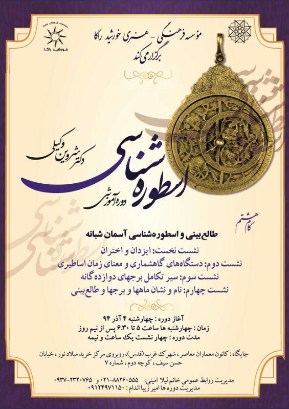 دورهی آموزشی-پژوهشیِ اسطورهشناسی که در موسسهی فرهنگی-هنری خورشید، با همکاری کانون معماران معاصر و به استادی دکتر شروین وکیلی برگزار میشود، به بررسی روایتهای اساطیری ایران و تمدنهای همسایه میپردازد. «طالعبینی و اسطورهشناسی آسمان شبانه» نام هشتمین گام از مجموعه دورههای اسطوره شناسی ایرانی است که در چهار نشست برگزار خواهد شد. هرگام از دورهی اسطوره شناسی ایرانی در قالب گامهایی یک ماهه برگزار میشود و در هر مرحله سرفصلی تاریخی از اساطیر ایران زمین به تفصیل مورد بررسی قرار میگیرد و گاه به باورهای دیرینهی دیگر سرزمینها نیز اشاره میشود و تحلیلی مقایسهای از مضمونها ارائه میشود برای آشنایی بیشتر با دیدگاه و رویکرد استاد و مرور مقالهها و کتابهای او در این زمینه میتوانید به این نشانی بنگرید: